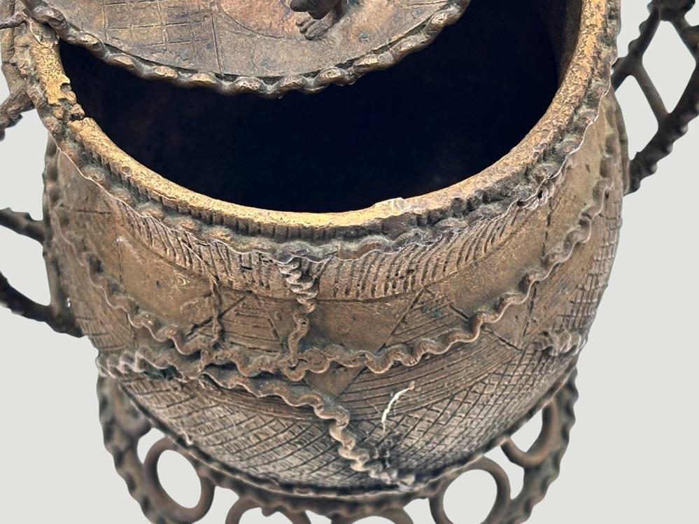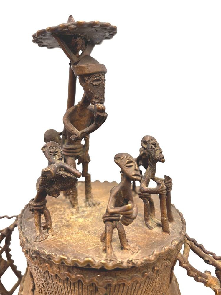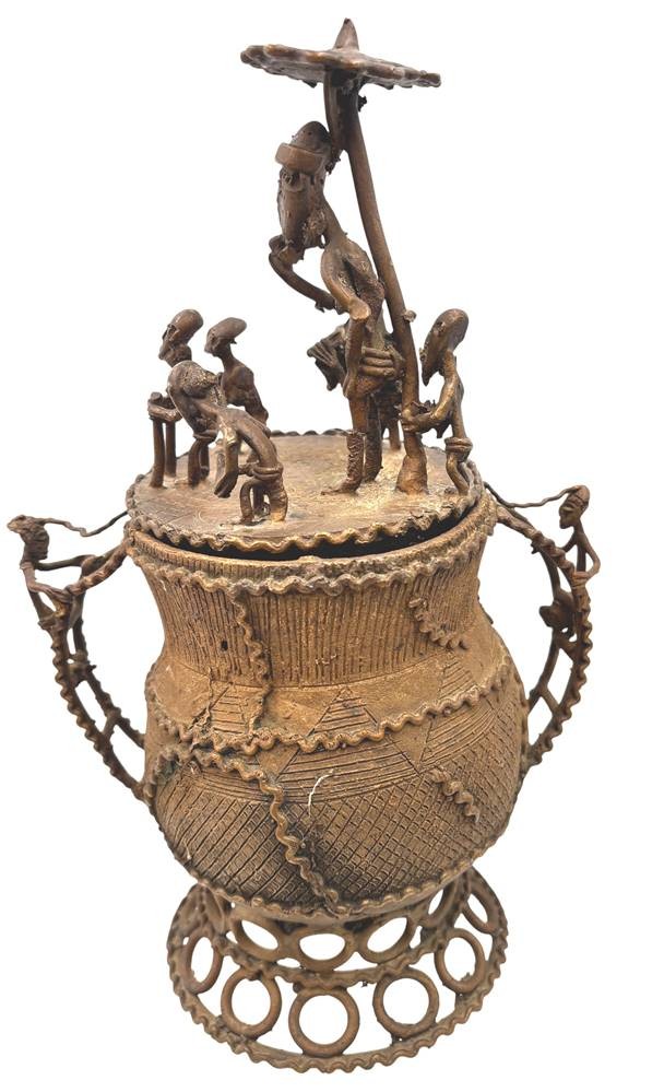 Kudou Bronzegefäß der Ashanti H-28 cm, mit 22 kl. Bronze-Figuren, je ca. H-9 cm
