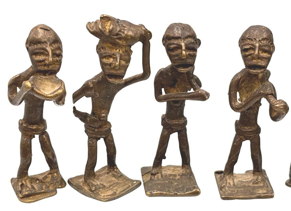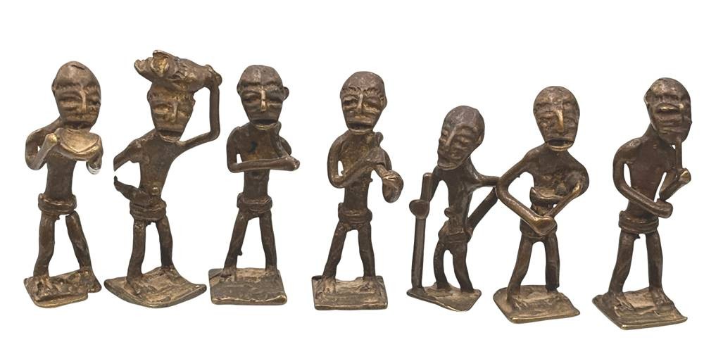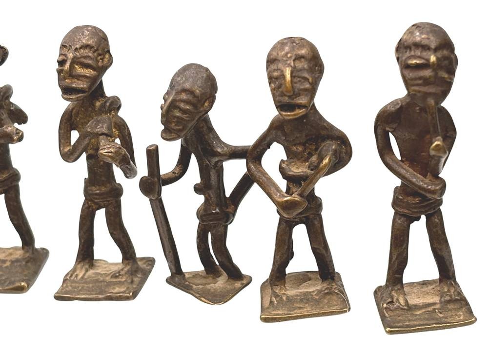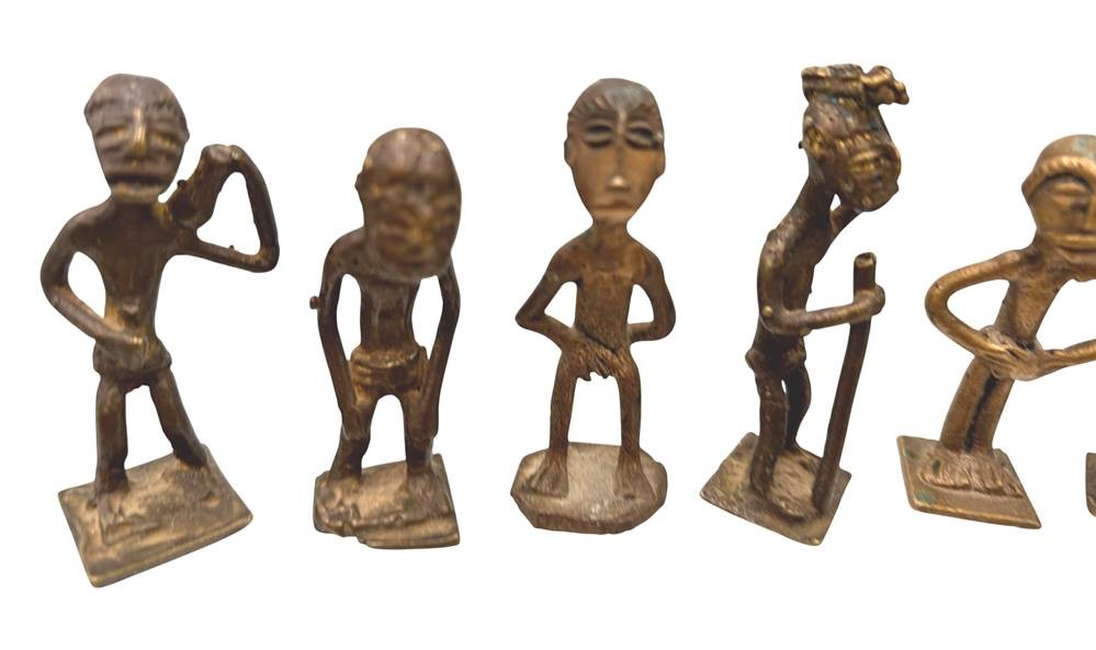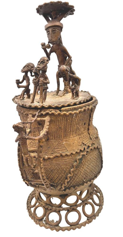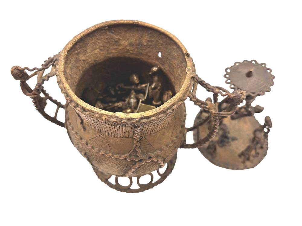 Kudou Bronzegefäß der Ashanti H-28 cm, mit 22 kl. Bronze-Figuren, je ca. H-9 cm [1]