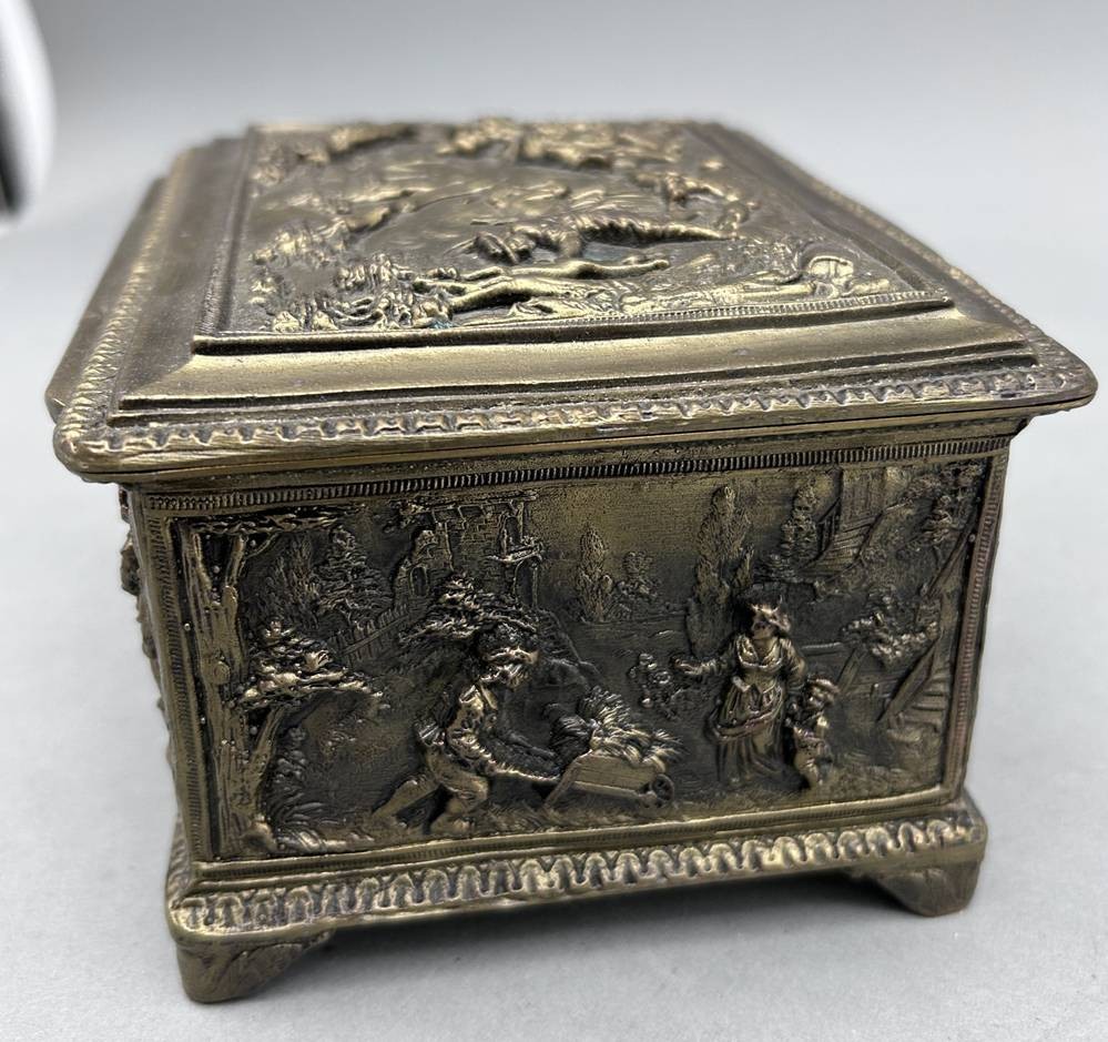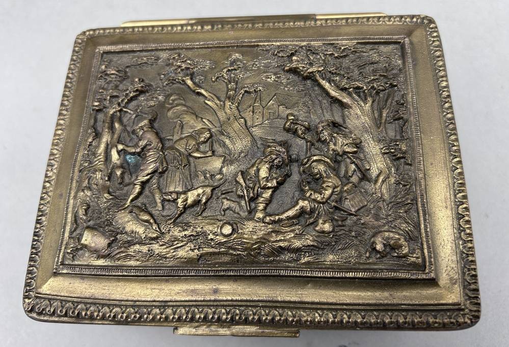 massive Messing-Deckeldose mit Landsknecht-Motiven, H-ca. 9cm, 14,5x11 cm [1]