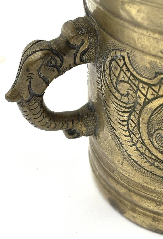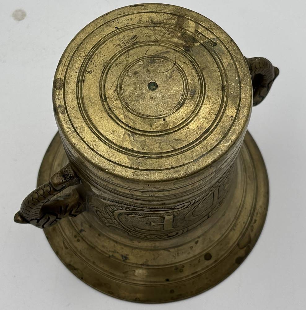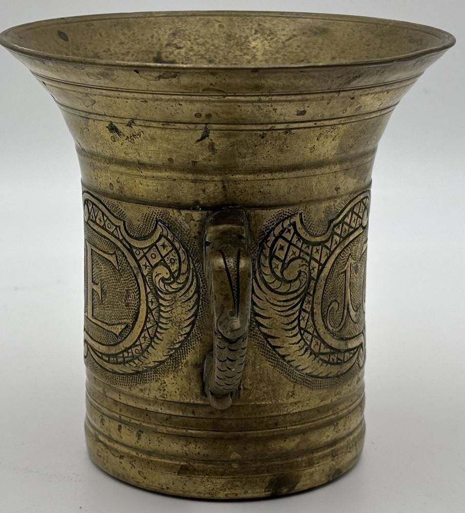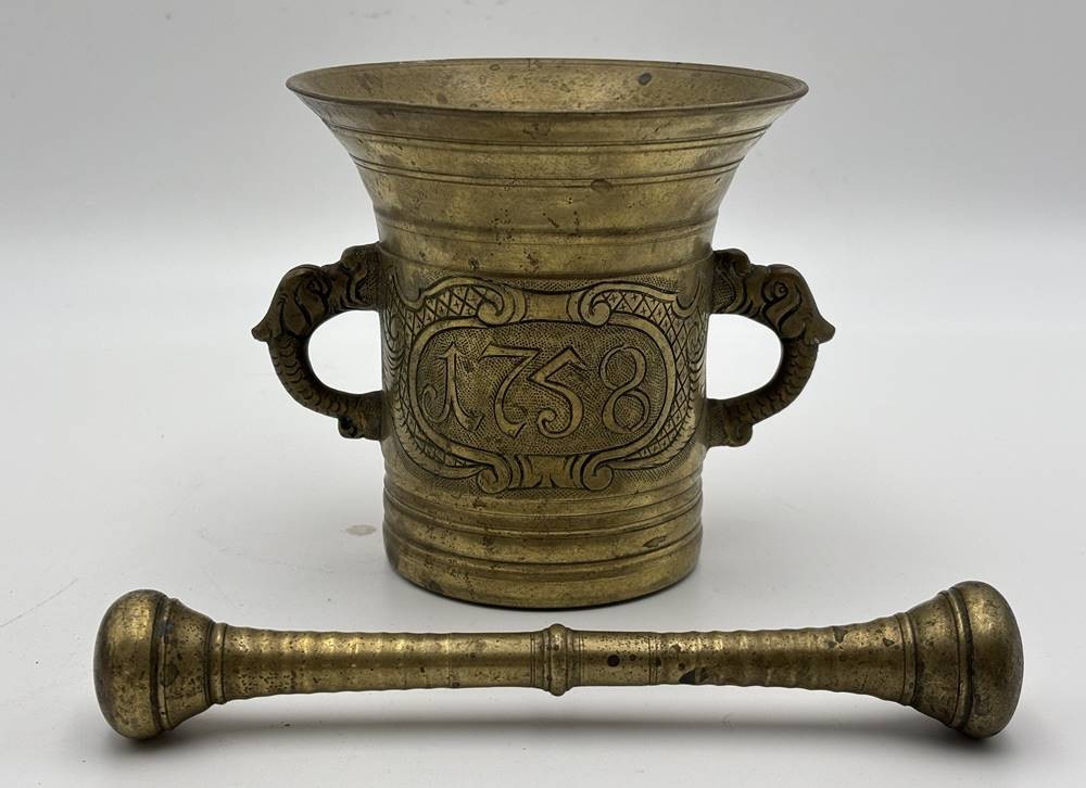 massiver Bronze Mörser mit Pistell, dat. 1758 und Monogramm BDE, H-13 cm, D-13 cm [1]