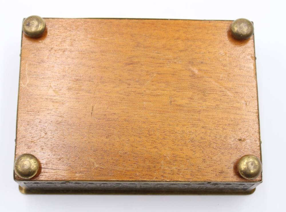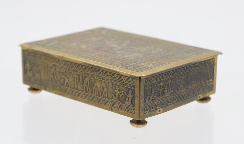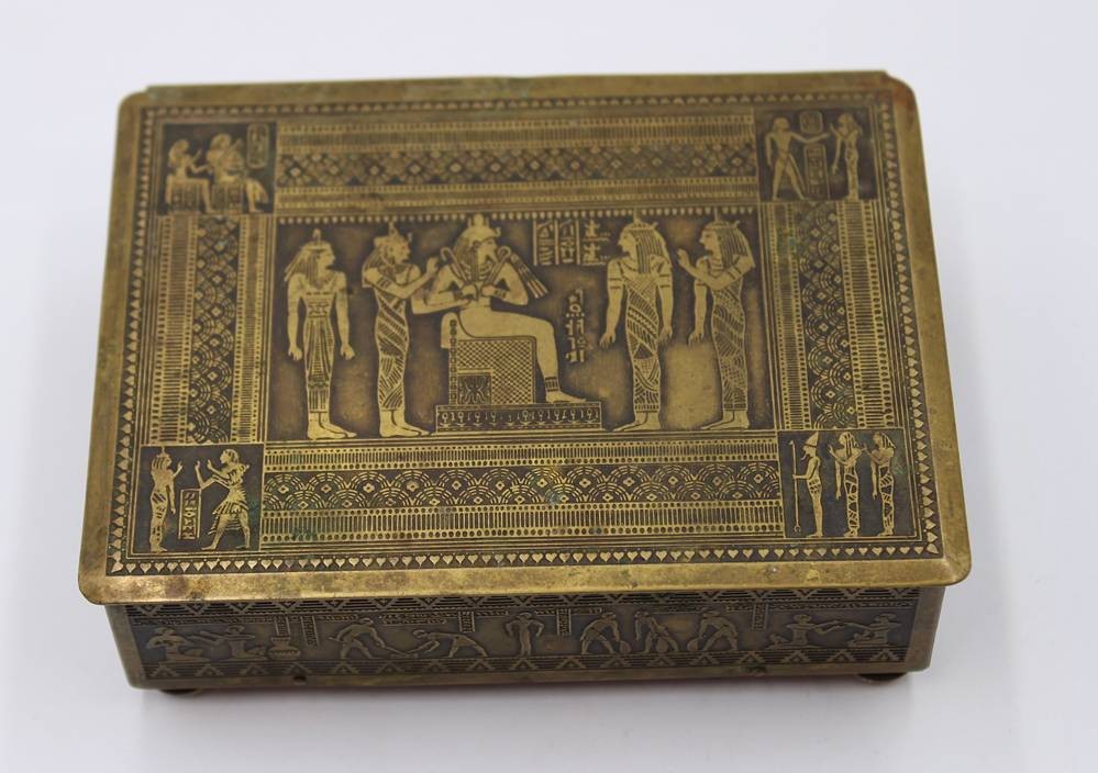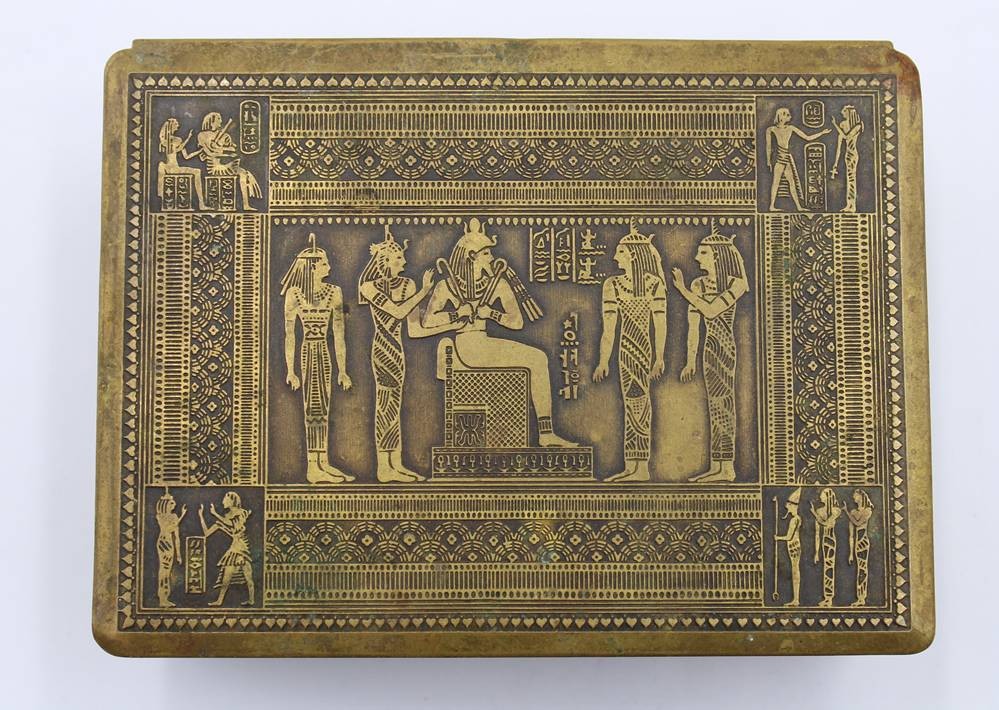 Messing-Zigarrenkasten mit Holzeinlage, altägyptisches Dekor, H-3,8cm B-12,5cm T-9,5cm [1]