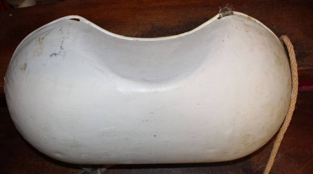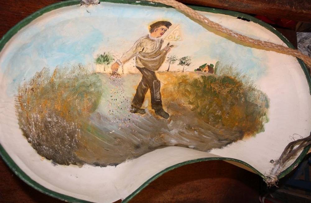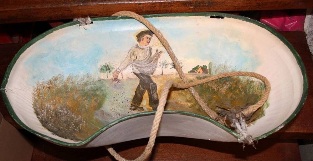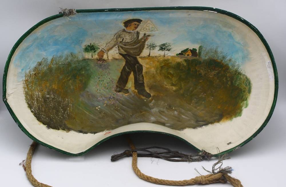 Nierenförmige Saatschale, Blech bemalt mit säenden Landmann, 65x30 cm, H-18 cm, an Schnur [1]