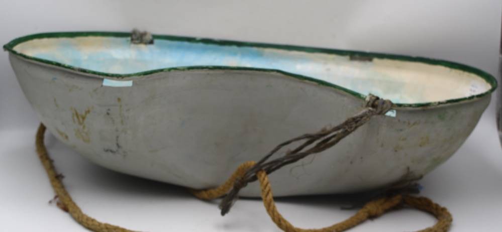 Nierenförmige Saatschale, Blech bemalt mit säenden Landmann, 65x30 cm, H-18 cm, an Schnur