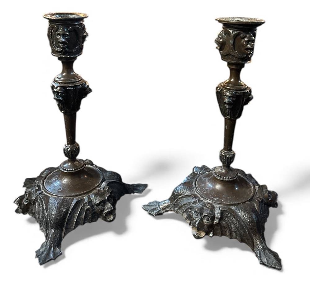 Paar Bronzeleuchter, umlaufend Fratzen, H-19 cm