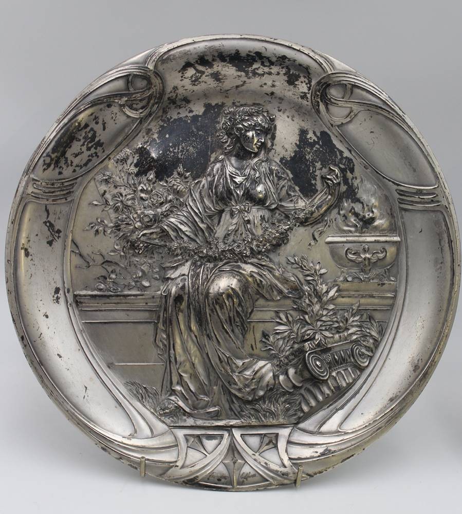 Paar Jugendstil-Reliefplatten, um 1900, Britannia-Metall, versilbert, "WMFB ox", Nr.281 und 281a, je mit Namensgravur und Datierung von 1904, je mit Altersspuren, ca. D-30cm. [1]
