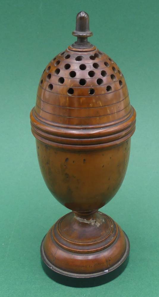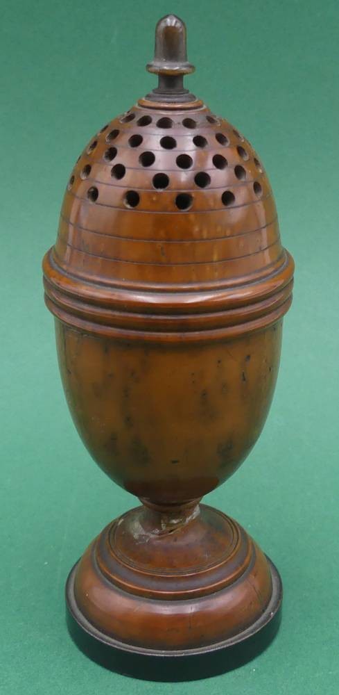 Pomander oder gr. Streuer??, poliertes Holz gedrechselt, Standplatte aus Horn, H-13 cm