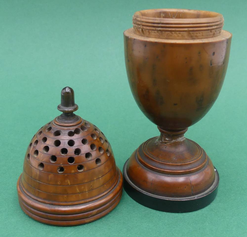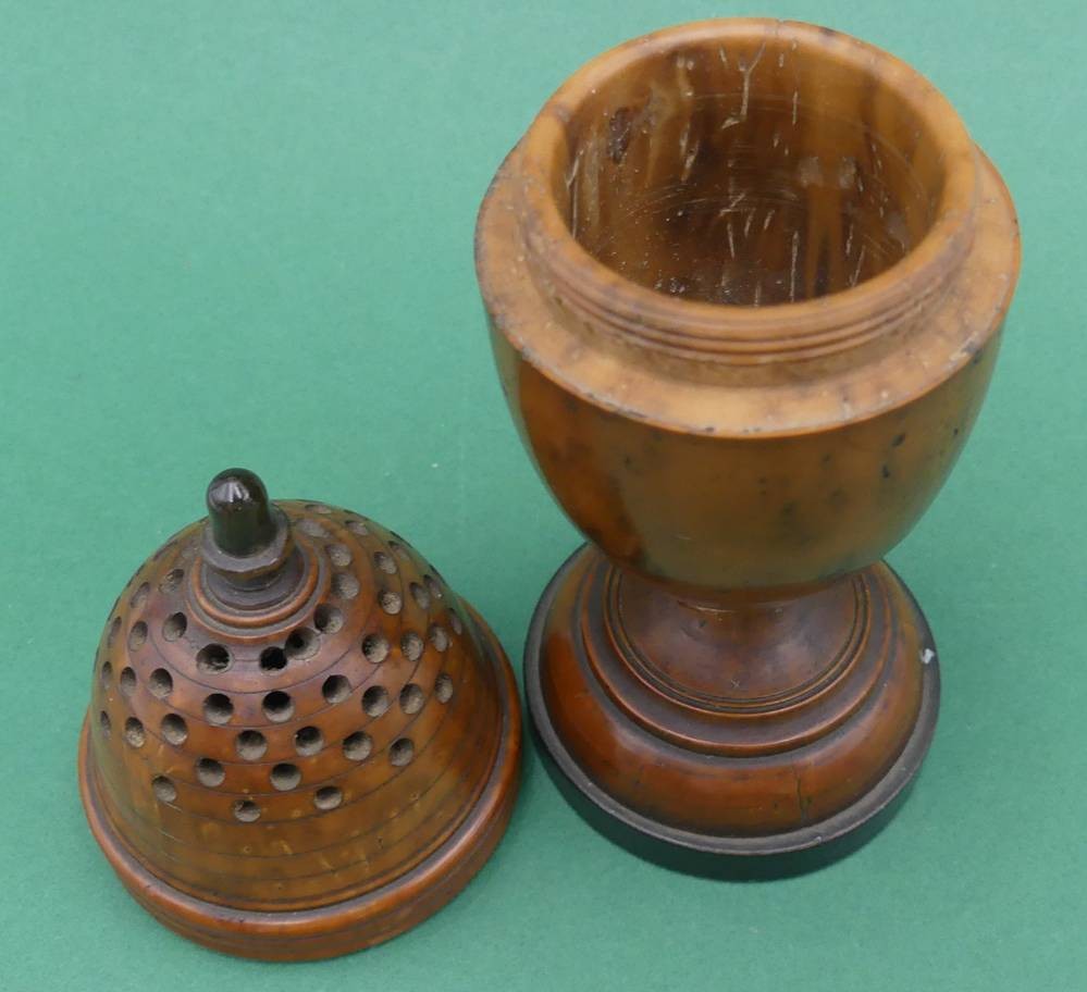 Pomander oder gr. Streuer??, poliertes Holz gedrechselt, Standplatte aus Horn, H-13 cm [1]
