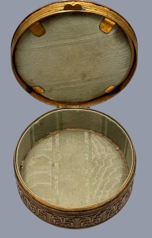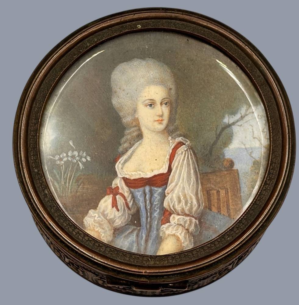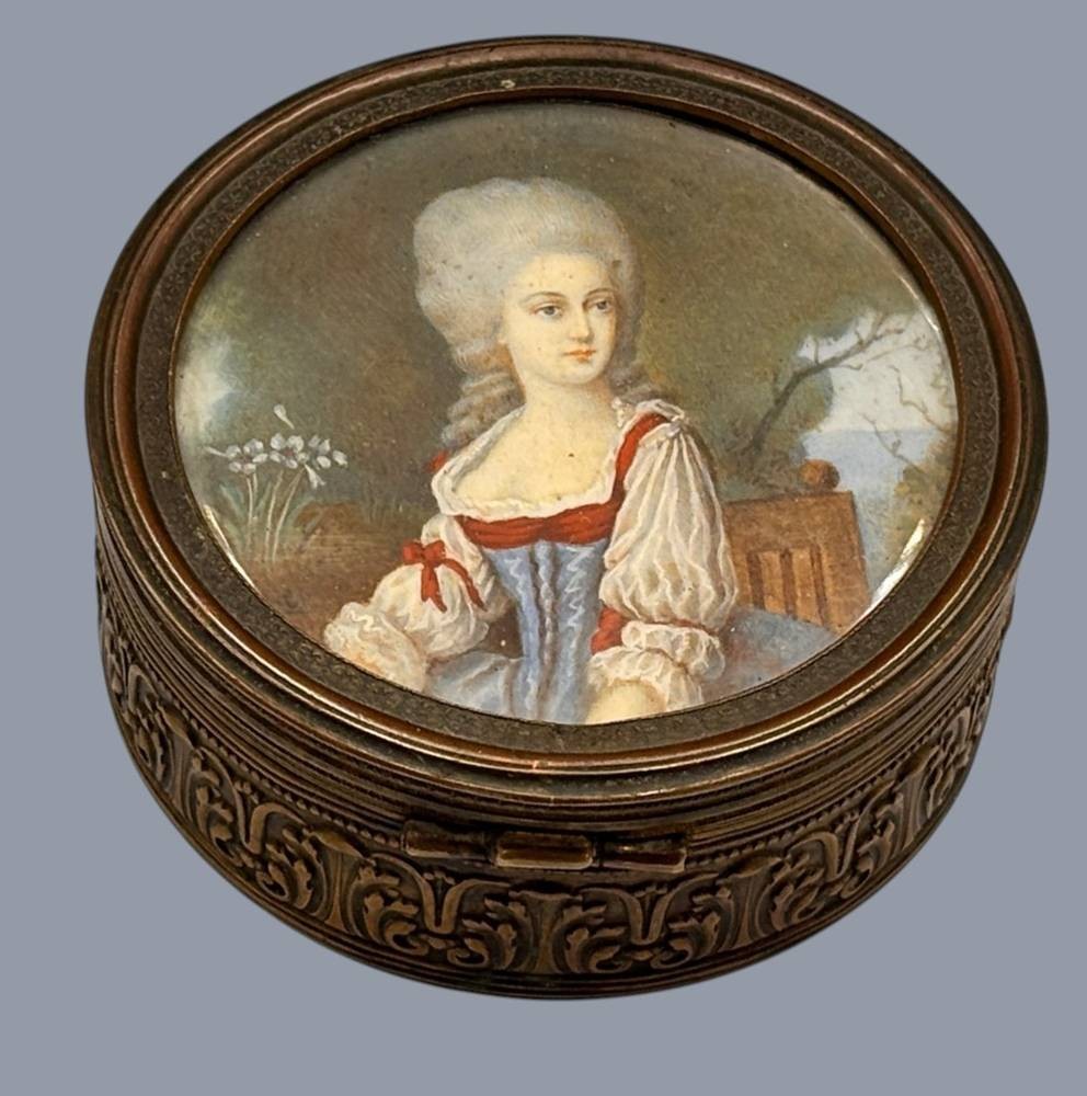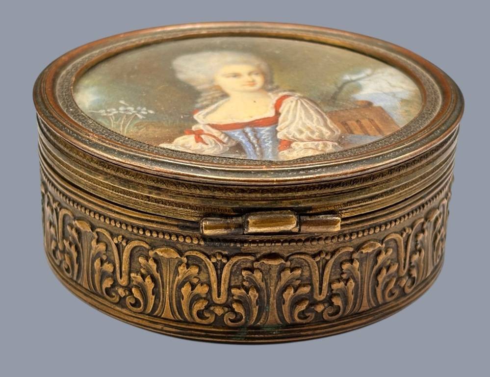 runde Bronze Schmuckdose, Deckel mit Miniatur-Malerei, Frauenportrait, wohl Ende 18.JHD?, H-3,6 cm, D-9 cm [1]