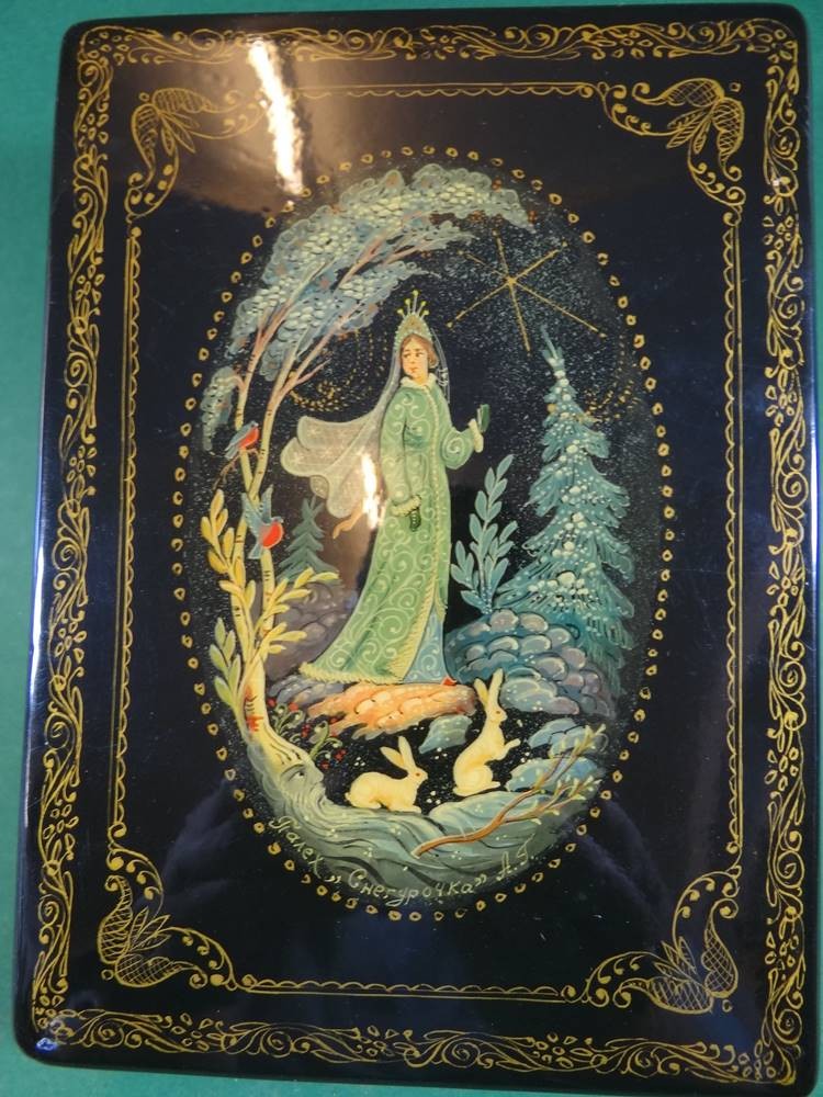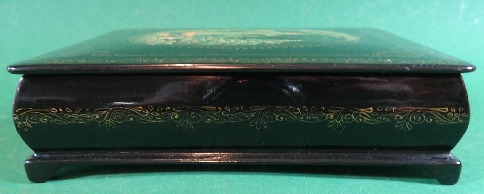 russische Lackdose, bemalt mit Märchenszene, signiert, guter Zustand, H-4,5 cm, 14,5x10,5 cm [1]
