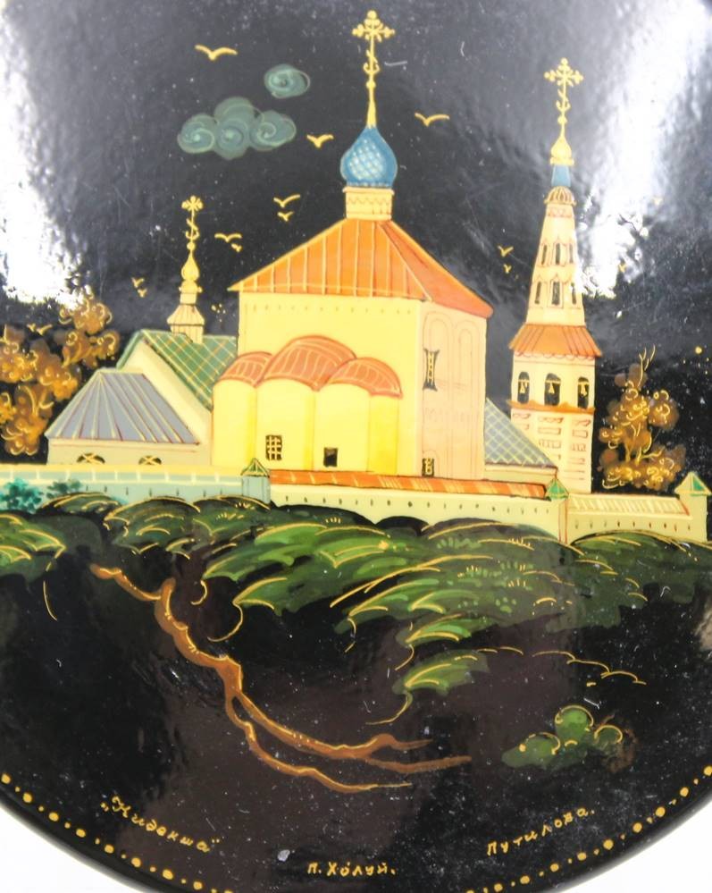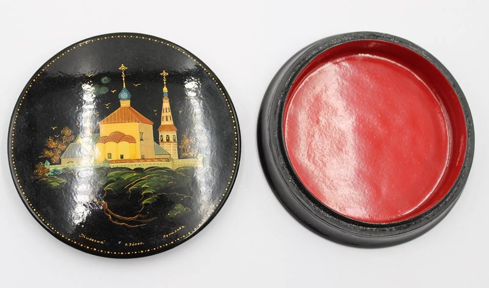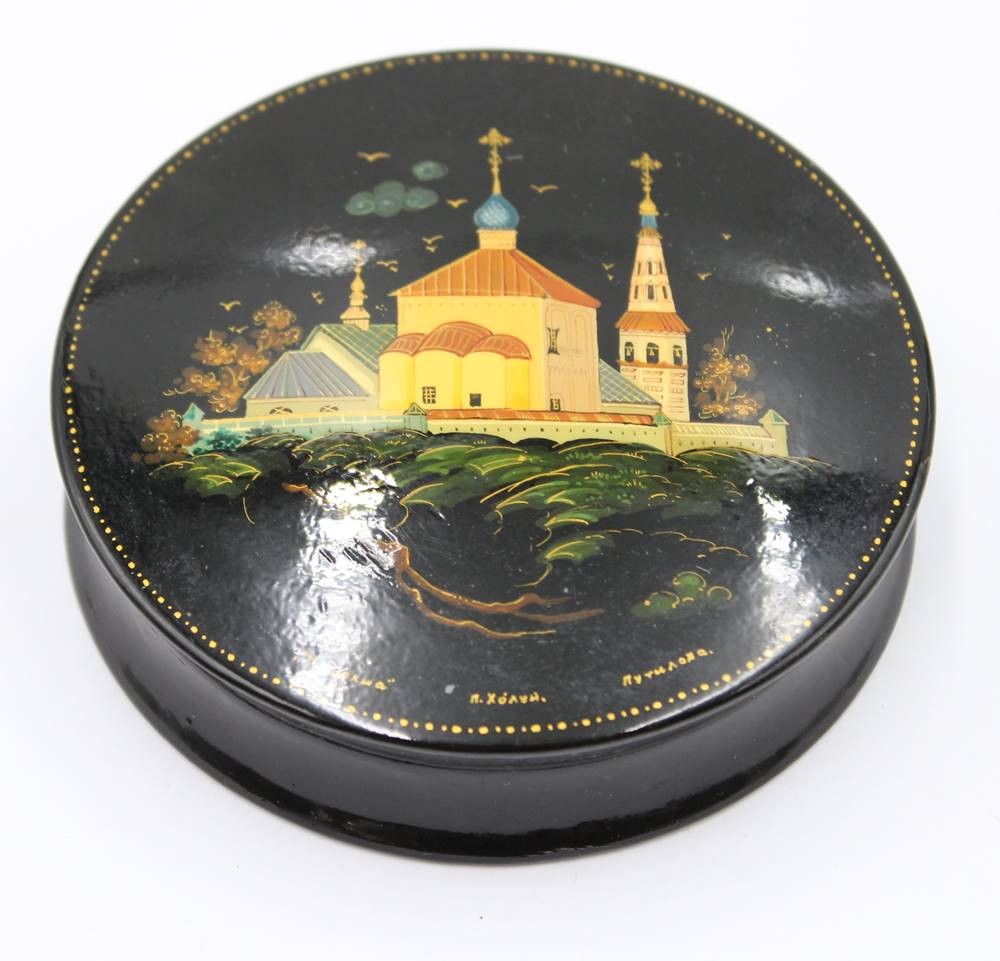 russische Lackdose, signiert, Kirchendarstellung, ca. H-2,5cm, D-10cm [1]