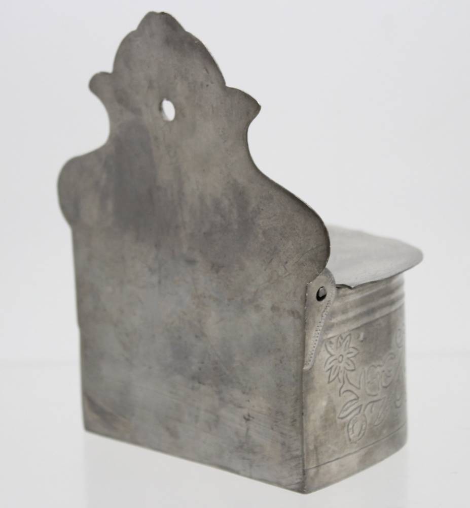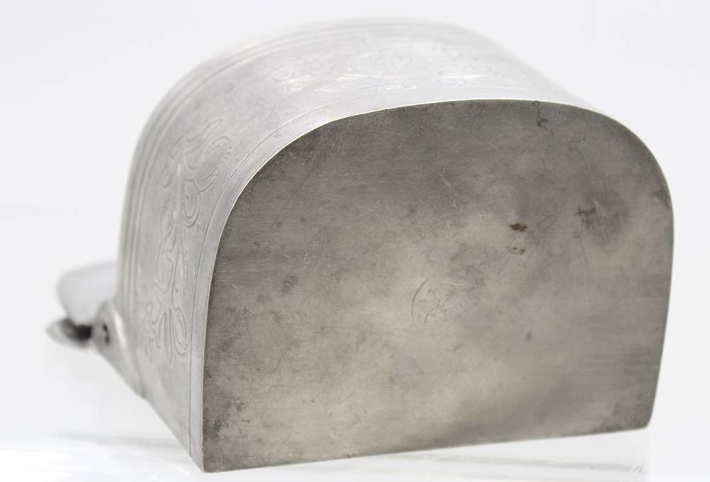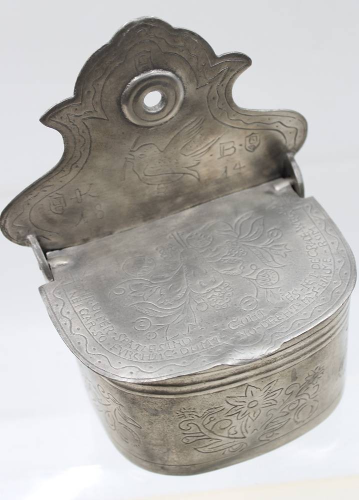Salzgefäß, Zinn, datiert 1814, Deckel mit Sinnspruch, Ulm, aus der Zeit ?, ca. H-16cm B-13cm T-8,5cm [1]
