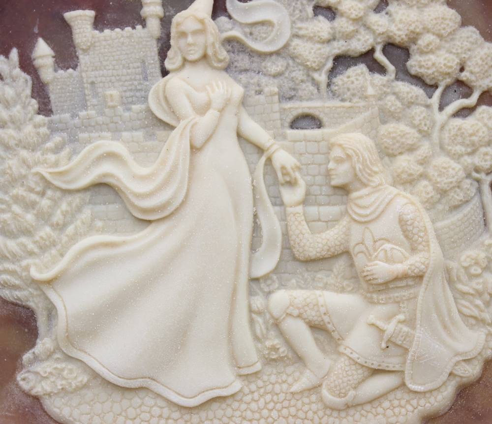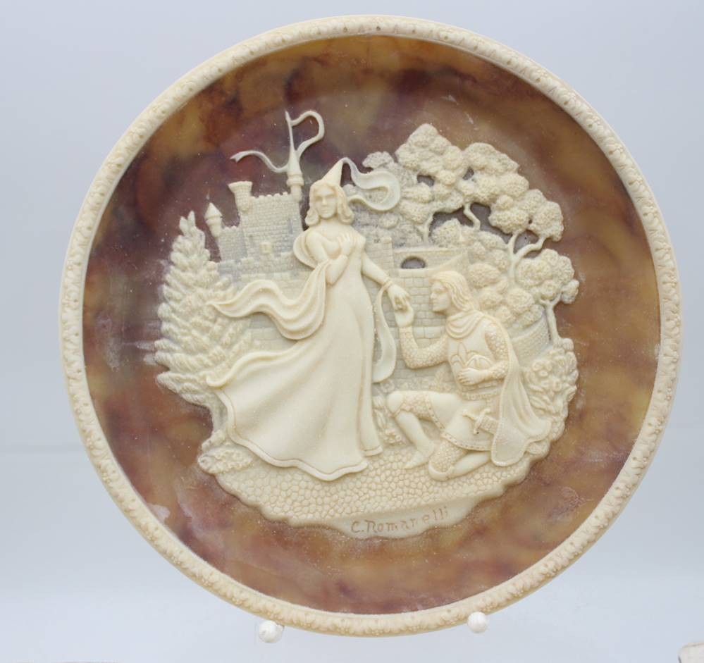 Sammelteller aus Incolay-Stein mit der Darstellung von Lancelot und Guinevere, Entw. Carl Romanelli, ca. D-26cm