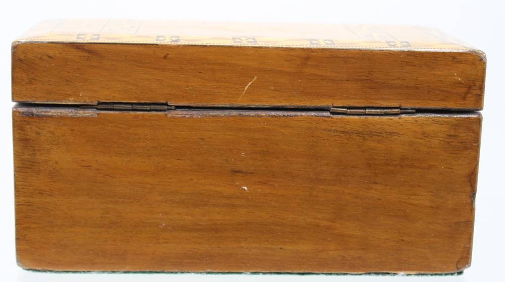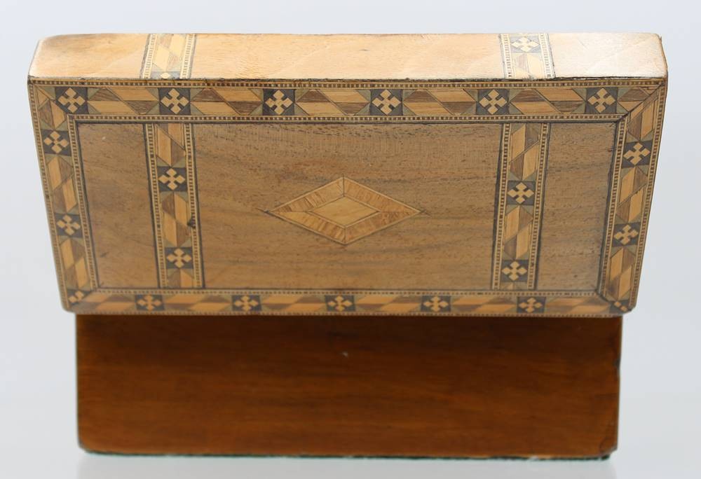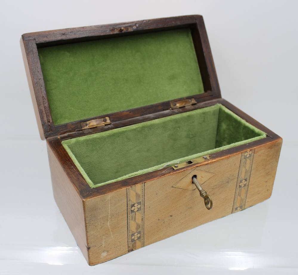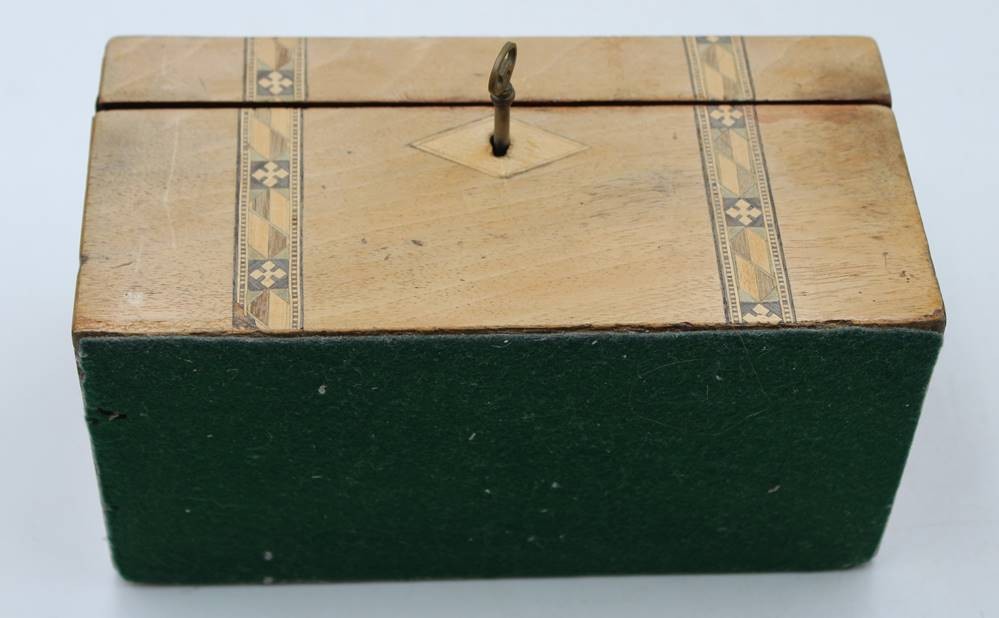 schön intarsierter Holzkasten mit Schlüssel, 10x20,5x10 cm