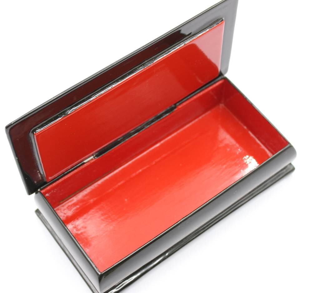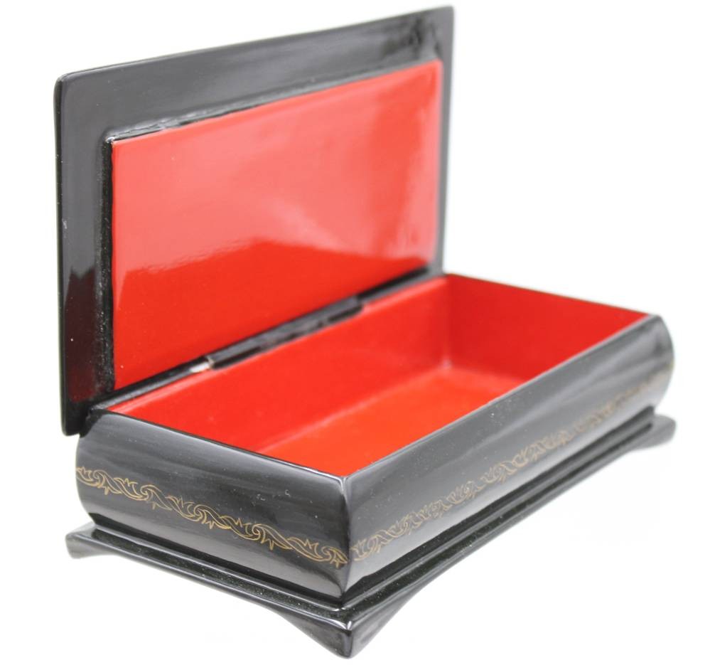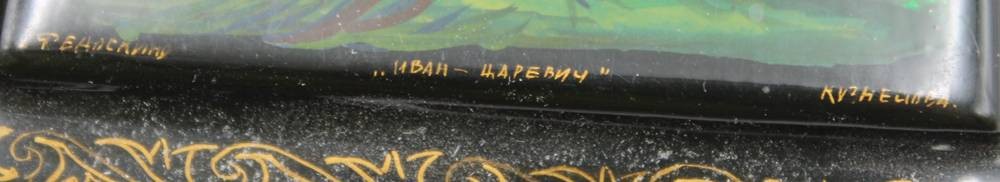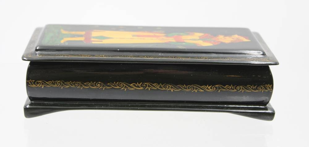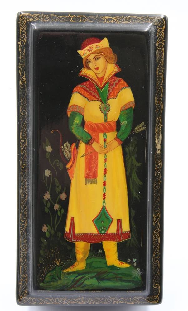 schöne russ. Lackdose, Deckel bemalt mit Vasilisa die Weise, signiert, 1x am Fuss abplatzer, ca. H-4,5cm 16 x 8cm [1]
