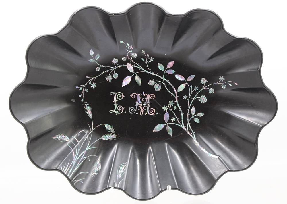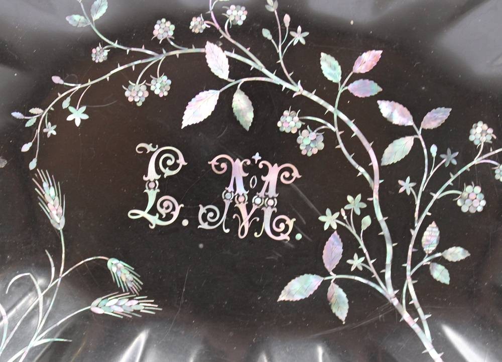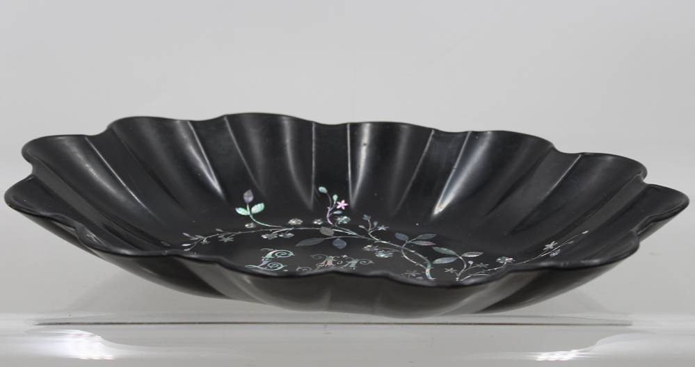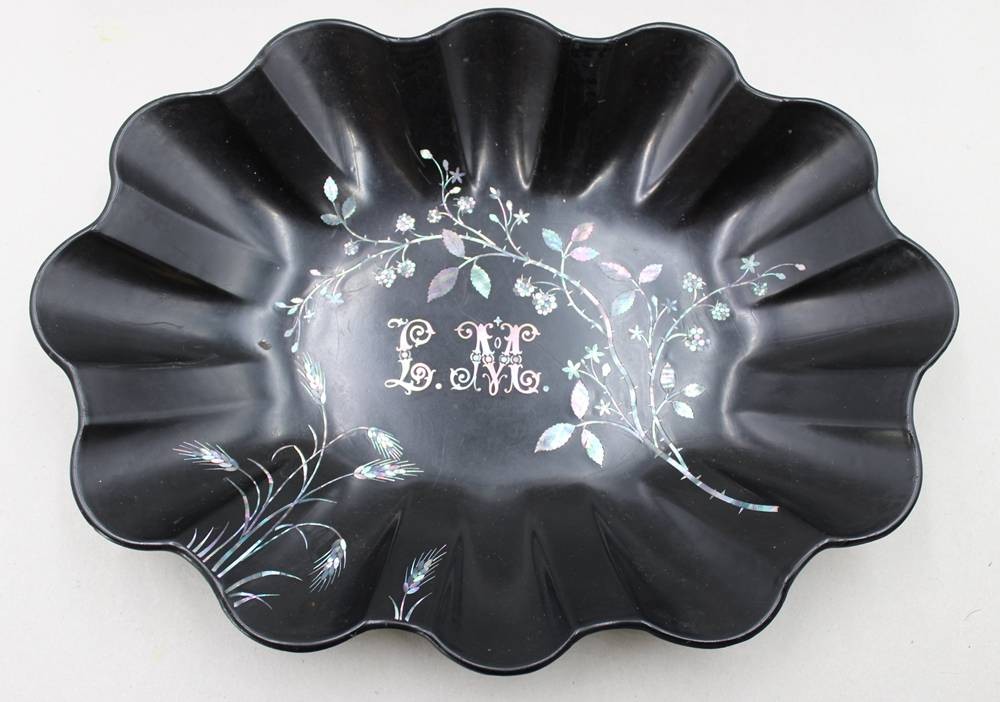 schöne Schale, Lackarbeit, Perlmutteinlagen, Ziermonogramm, ca. H-5cm B-34,5cm [1]
