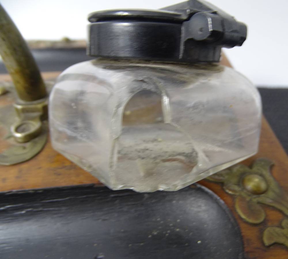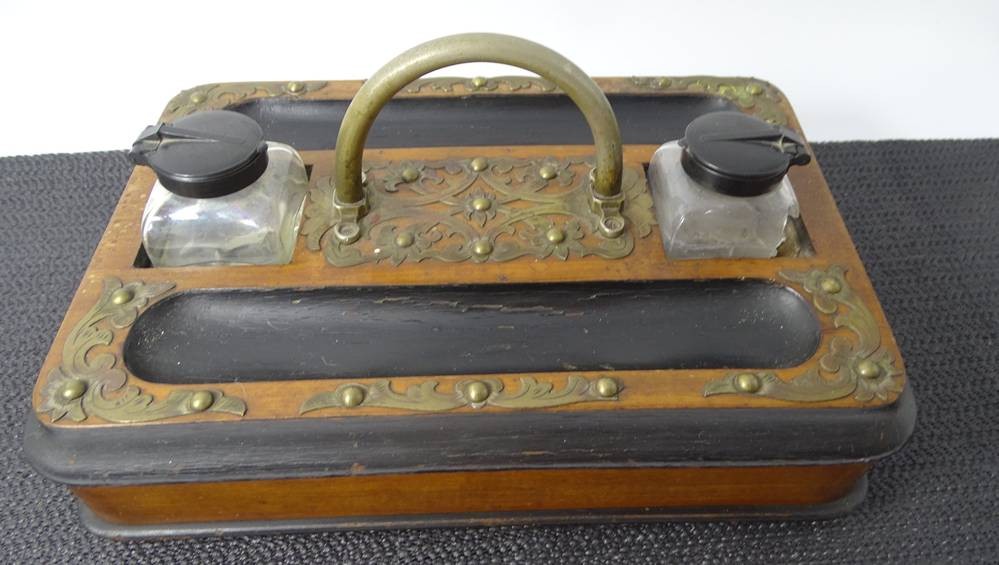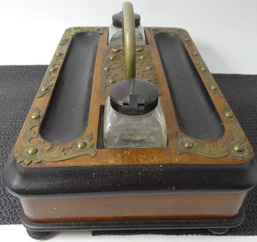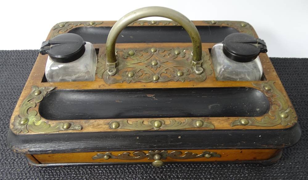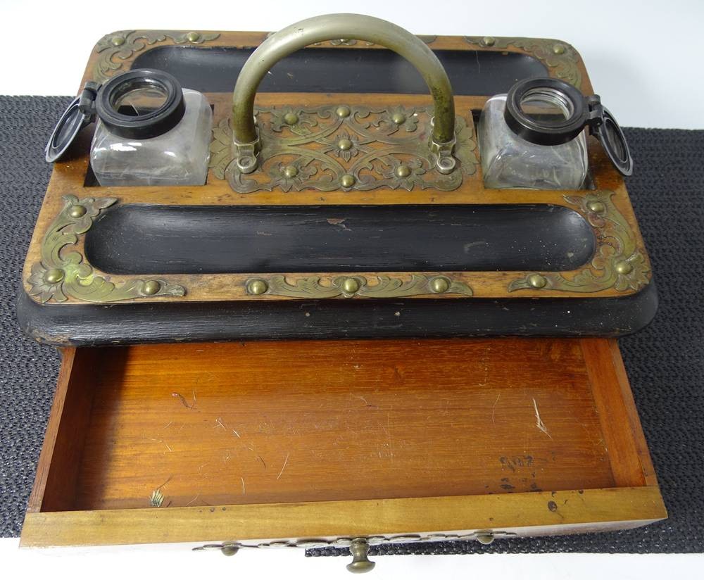 Schreibtischablage mit Schublade, 2 Tintenfässern (1x beschädigt) Messingbeschlägen und Griff, H-14 cm, 30x19 cm [1]