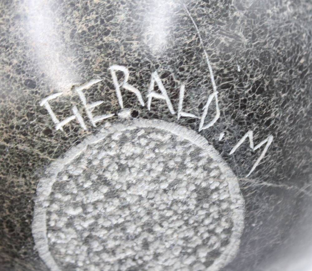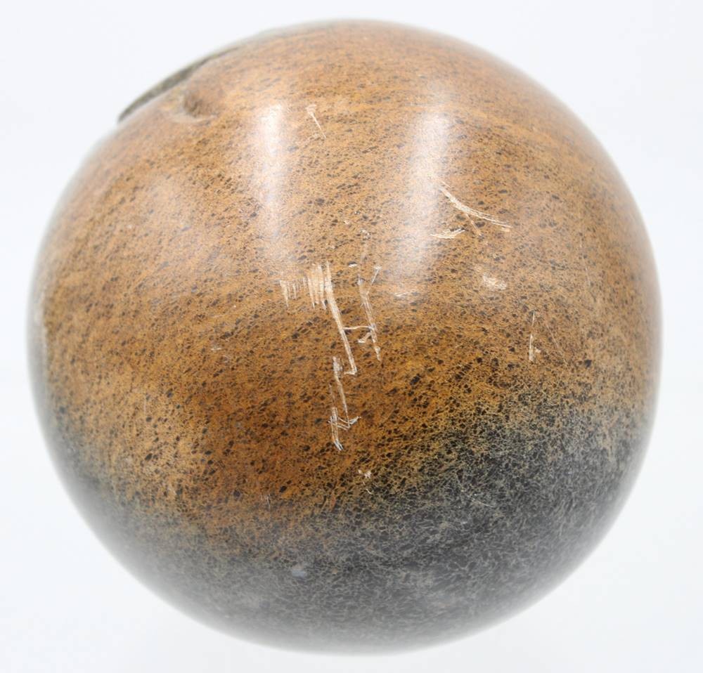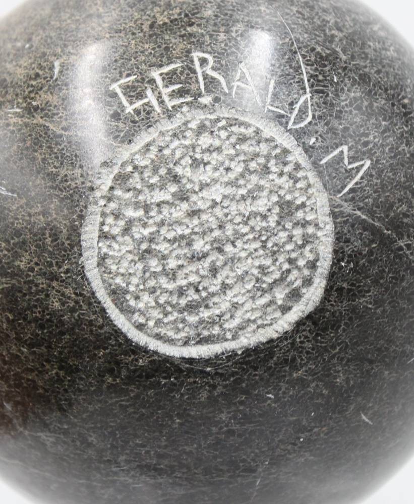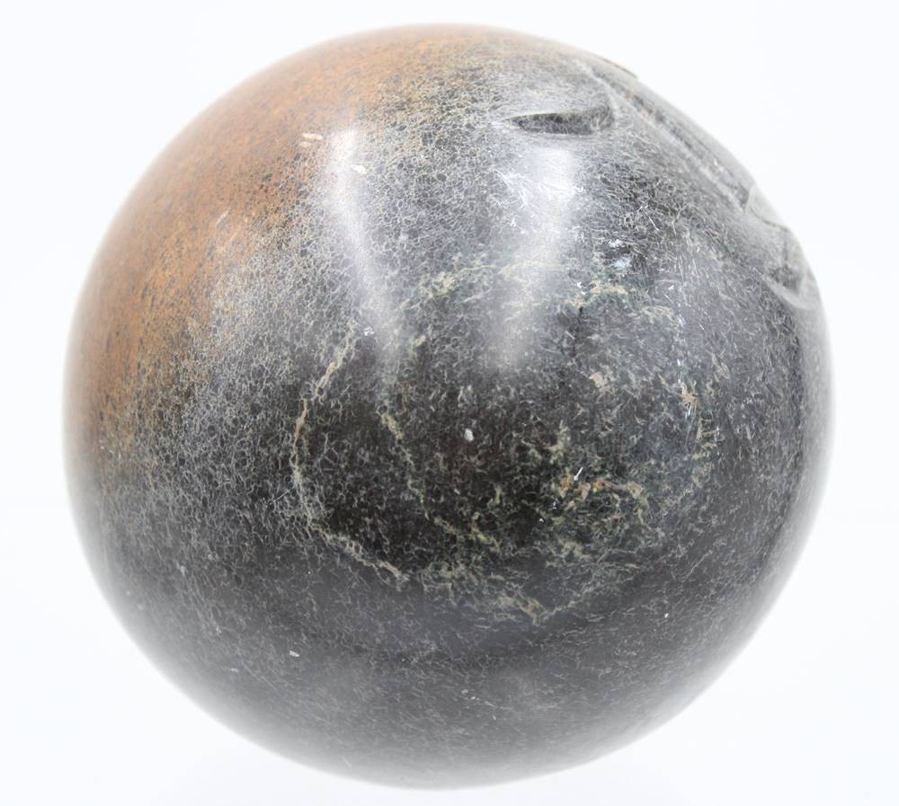 schwere Steinkugel mit Gesicht, wohl Serpentine aus Simbabwe?, signiert Herald M., D-12 cm [1]