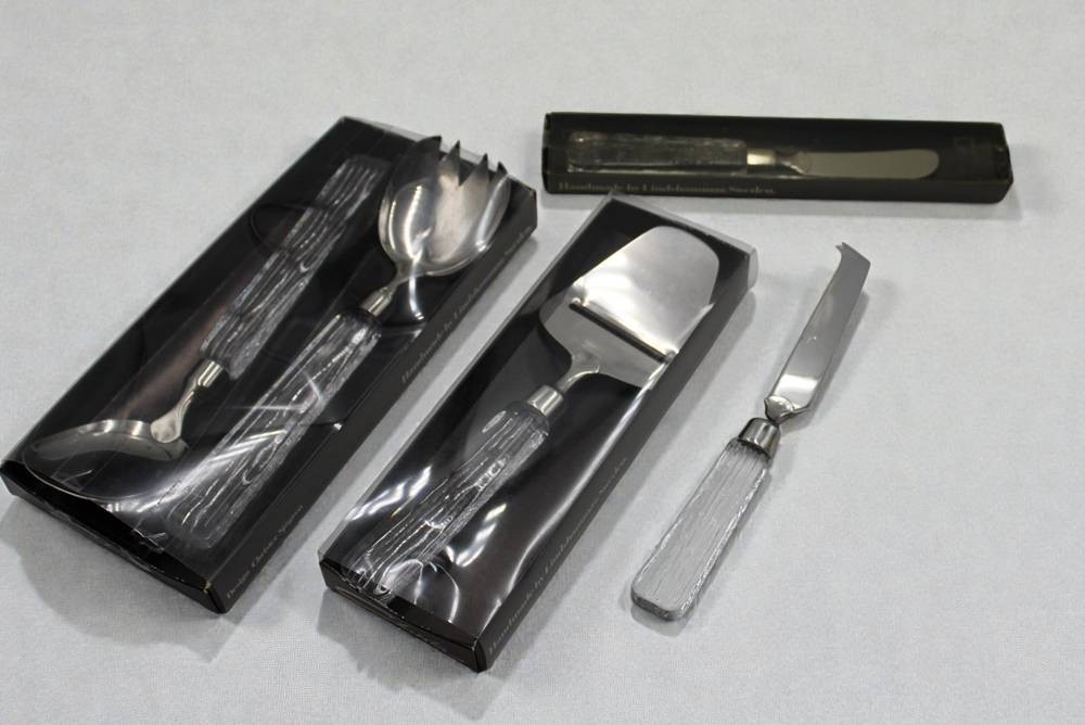 Slatabesteck, Käsehobel Butter und Käsemesser, EDelsthal Glasgriffe, Lindshammar, Design Christer Sjögren, Salatbesteck L-23cm [1]