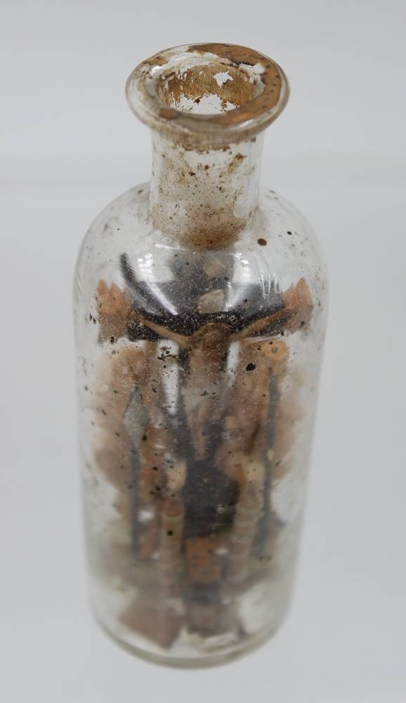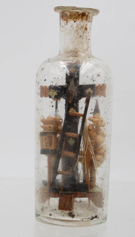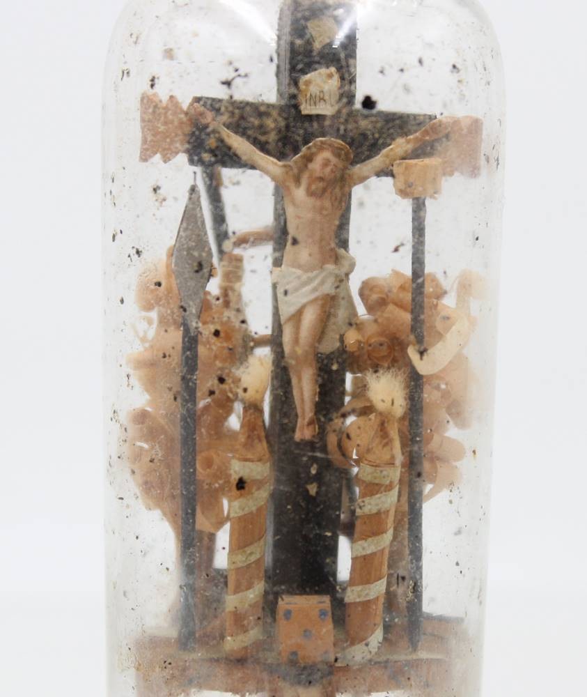 sogen. Geduldsflasche, um 1900, Christus am Kreuz, ca. H-11,5cm [1]