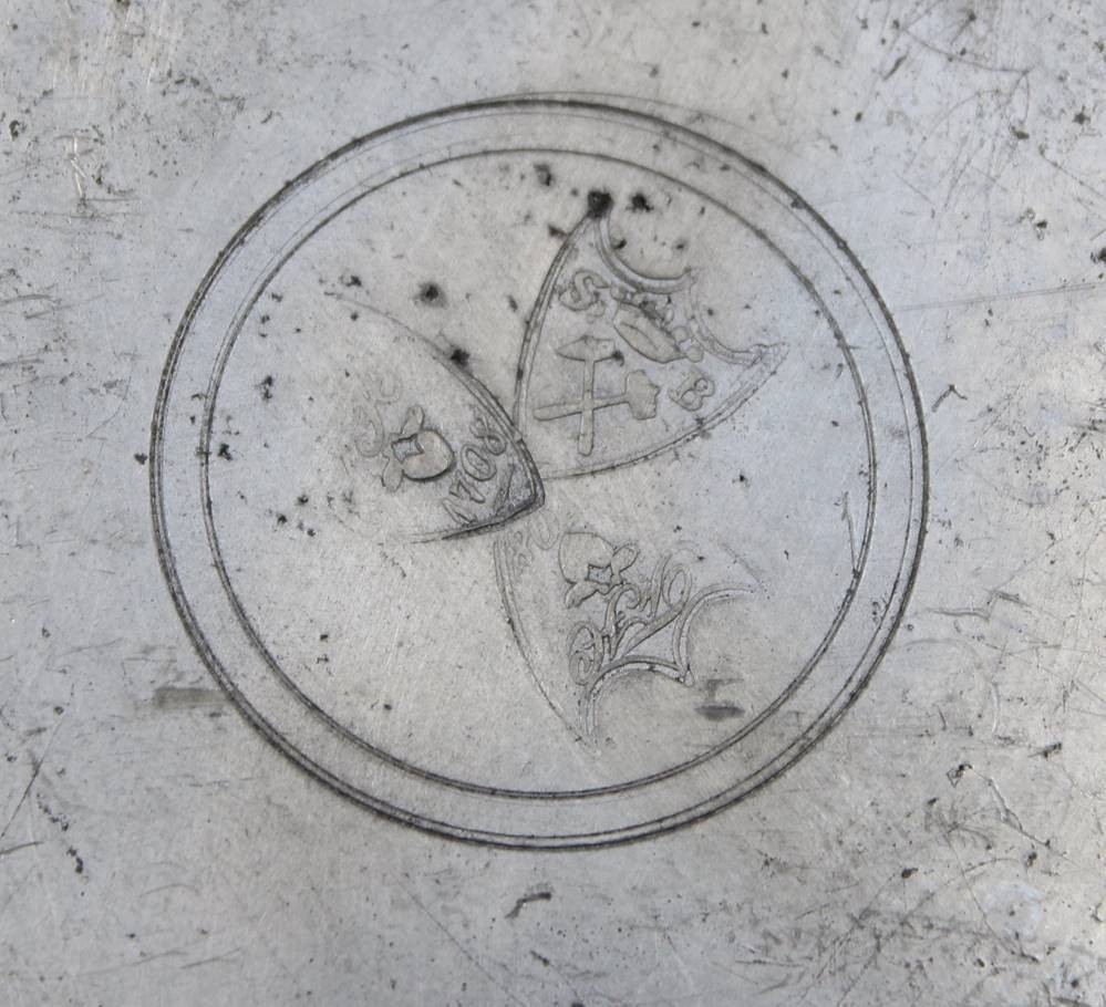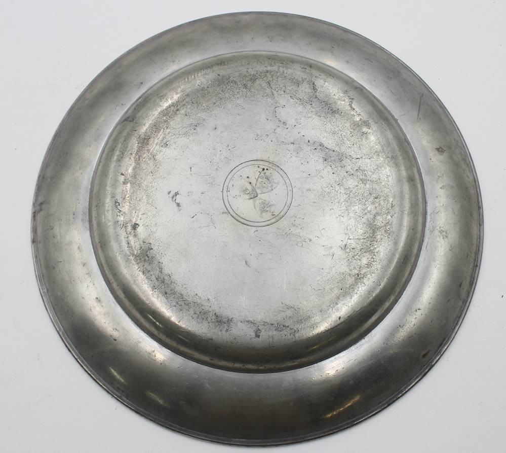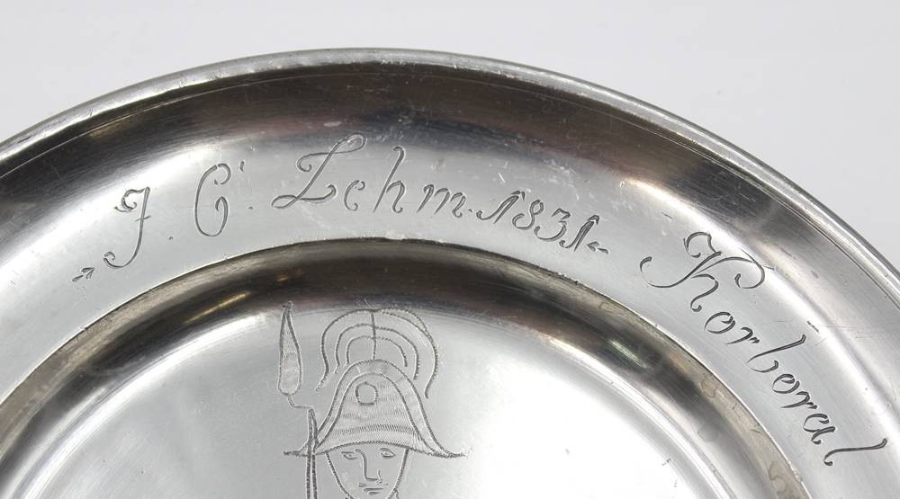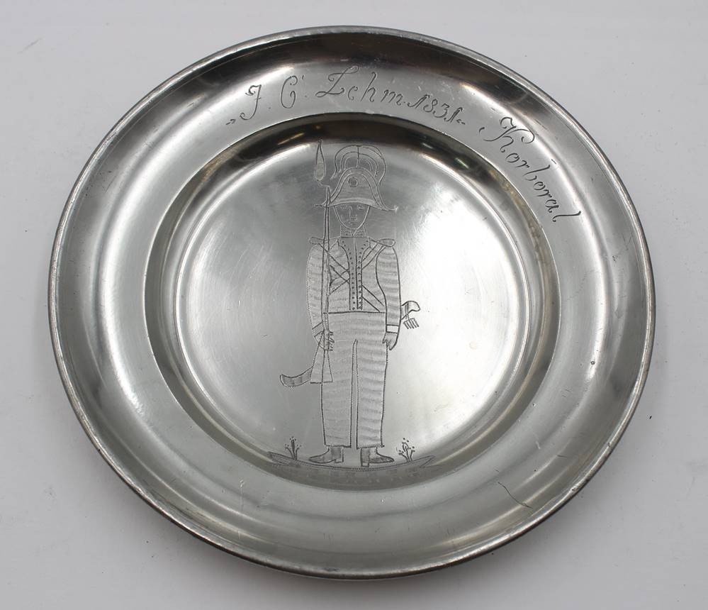tiefer Zinnteller, gaviert mit Soldaten, Namensgravur und datiert 1831, ca. D-24,3cm [1]