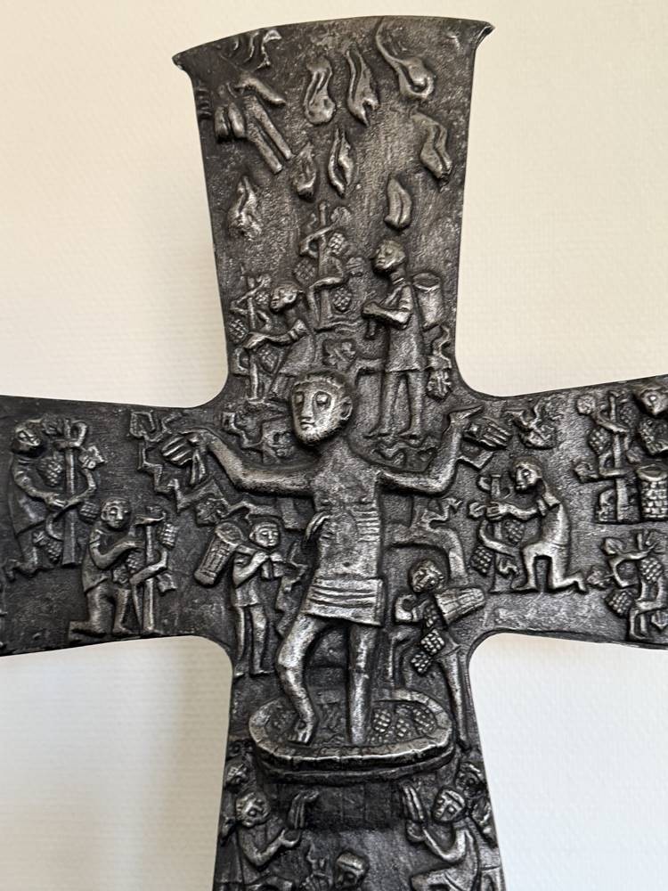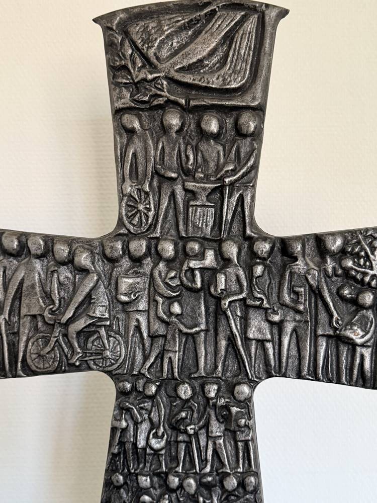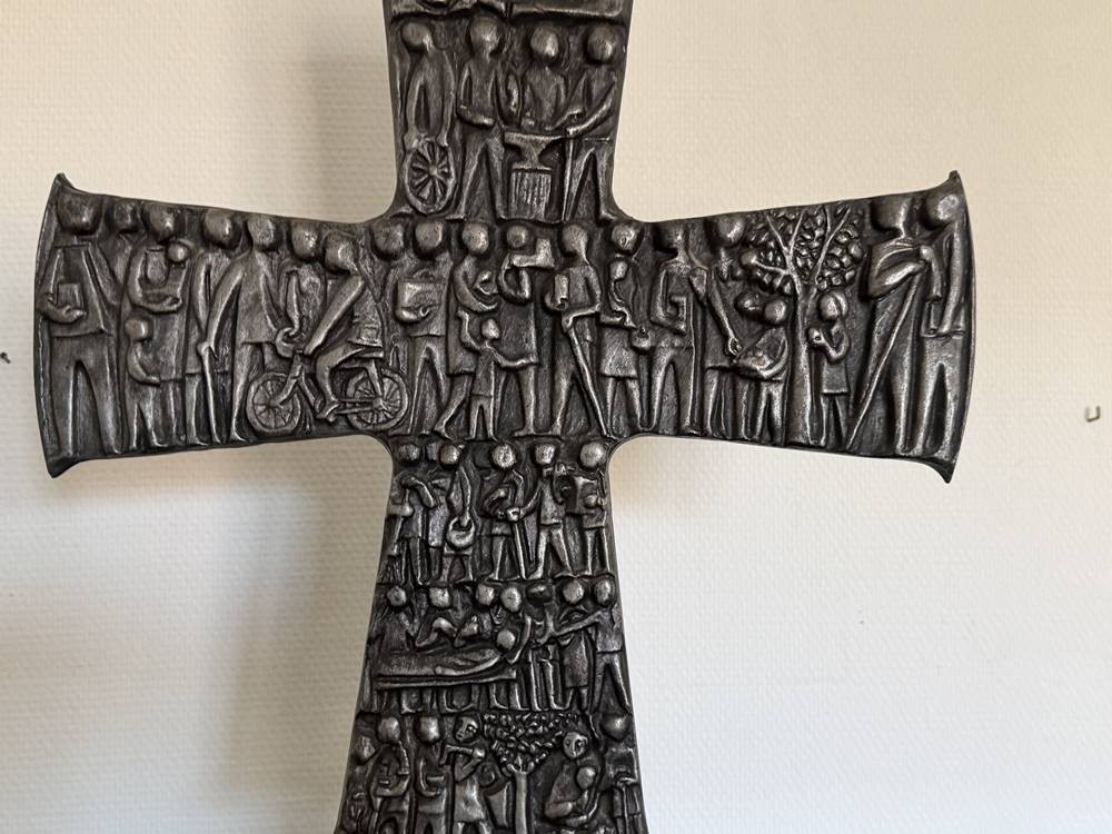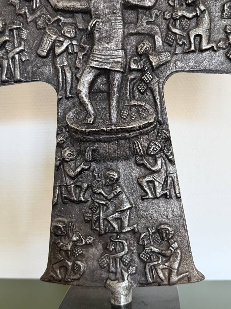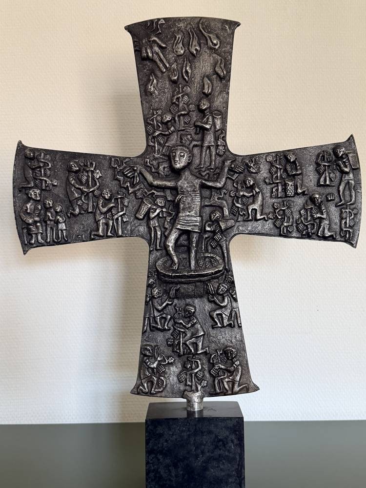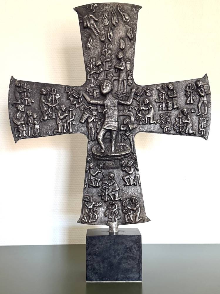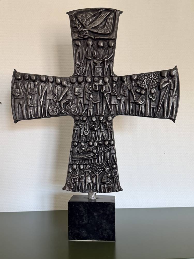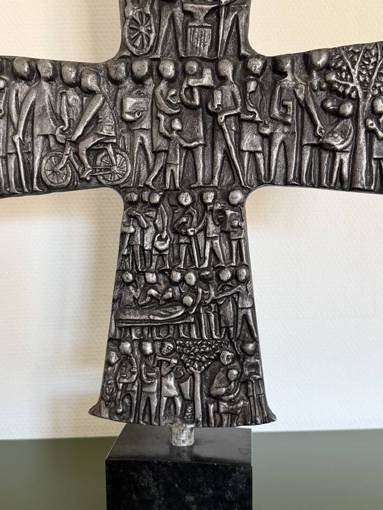 Tischkruzifix, beidseitig Figuren im Flachrelief, Zinn auf Marmorsockel, H-48 cm, B-43 cm [1]