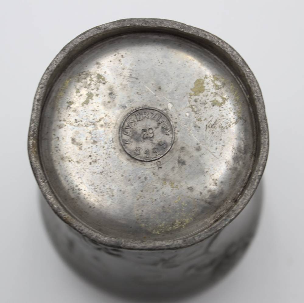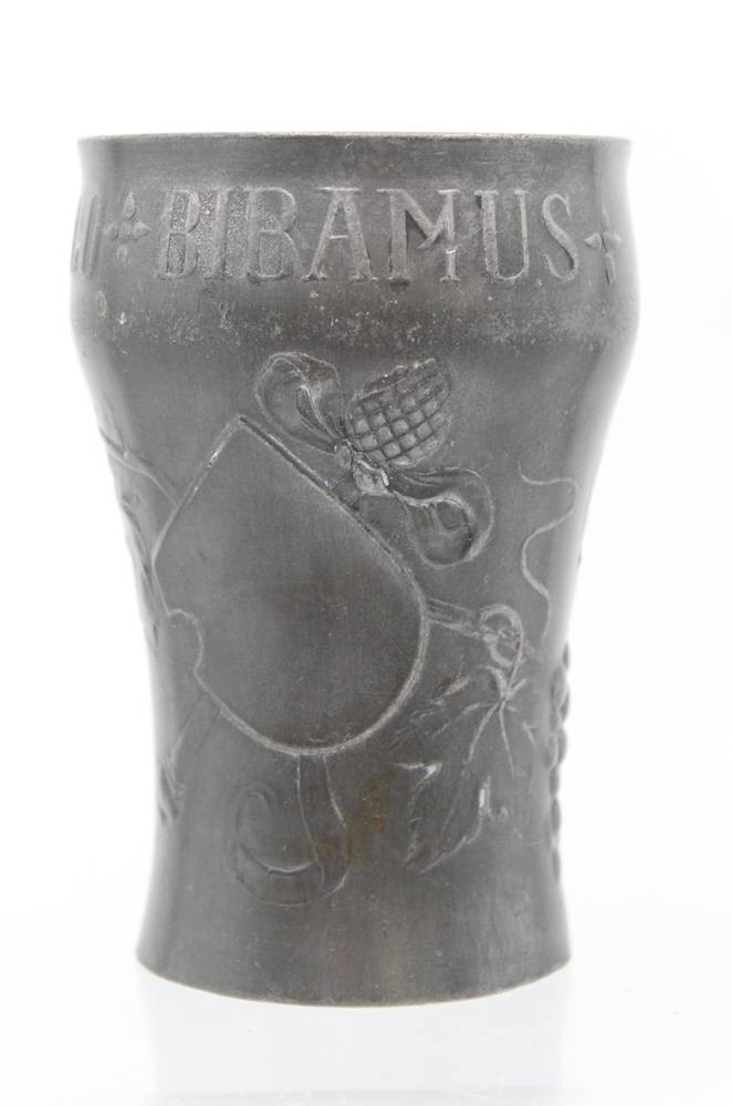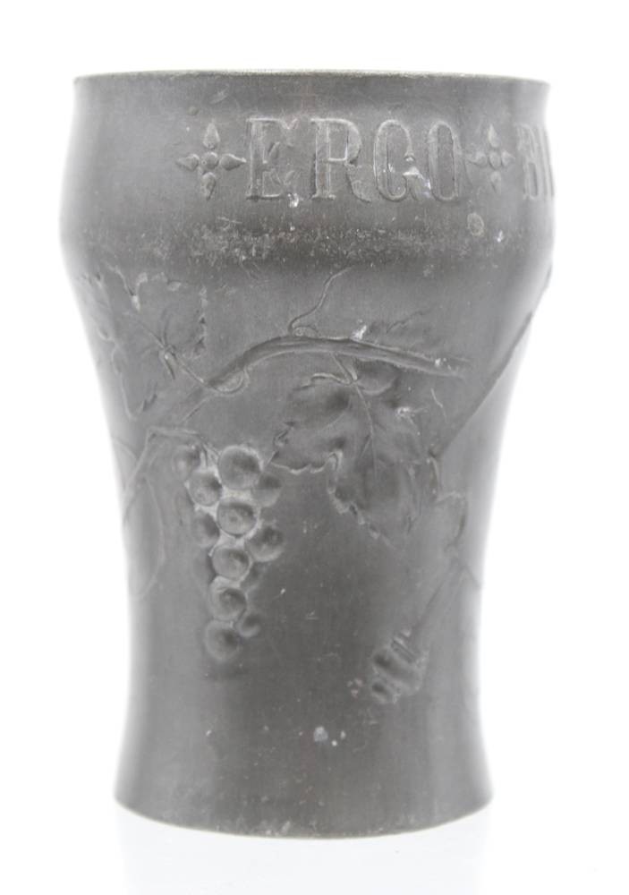 Trinkbecher, bezeichnet "Ergo Bibamus", Kayser Zinn, Nr. 4195, Altersspuren, ca. H-12,3cm [1]