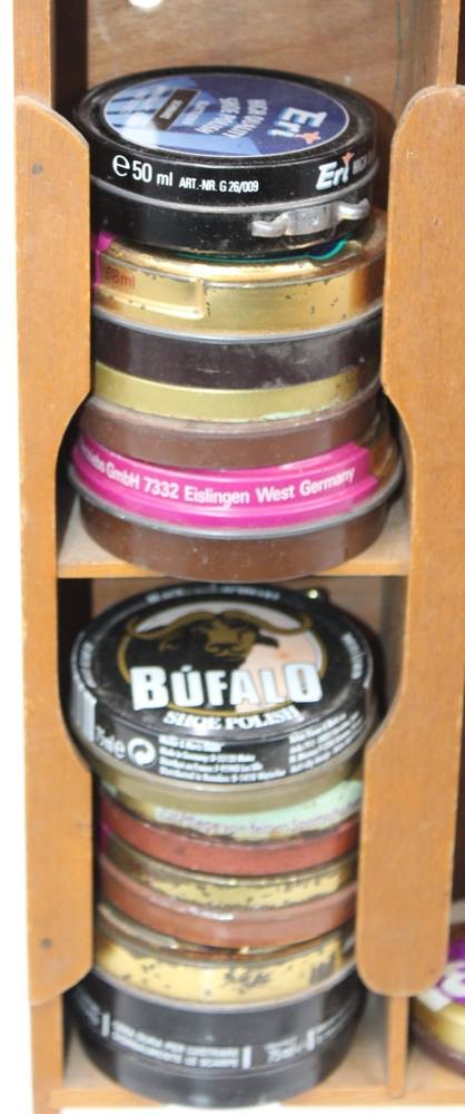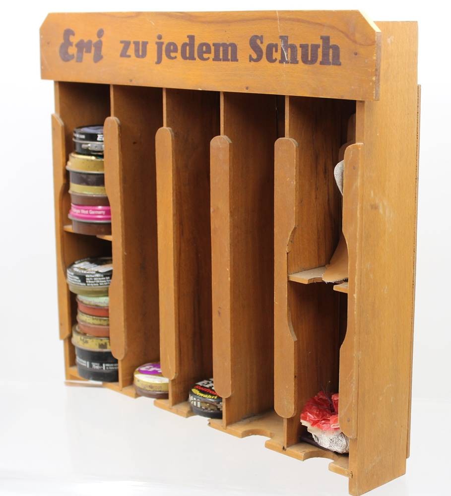 Verkaufsregal "Eri - zu jedem Schuh", anbei 13 leere Dosen, ca. 39,3 x 43cm [1]