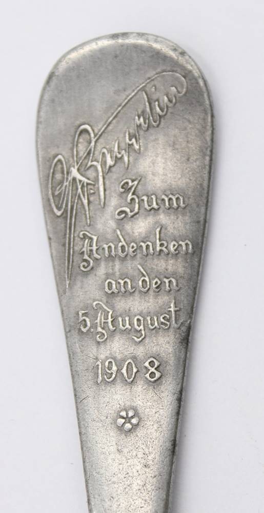 Vivatband "Vivat die Luftkreuzer!" sowie ein Zeppelin-Gedenklöffel aus dem Jahr 1908 [1]