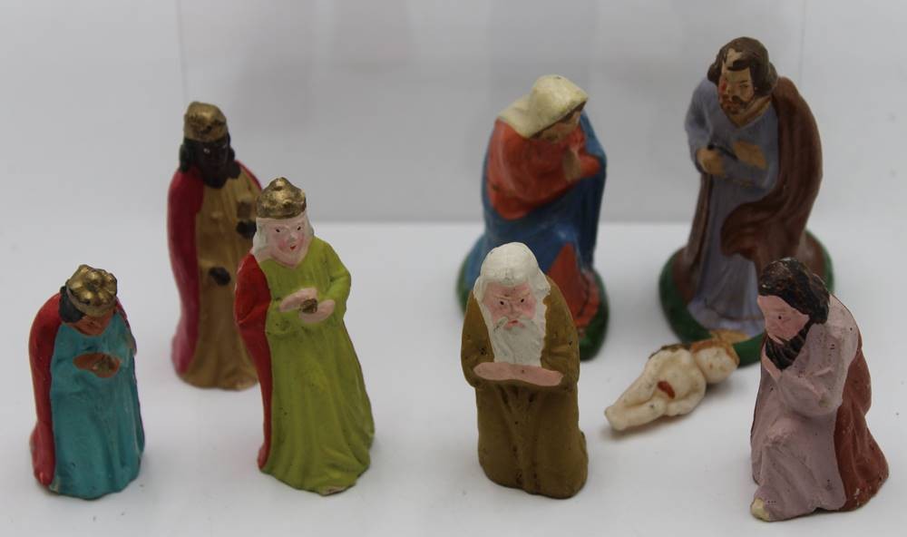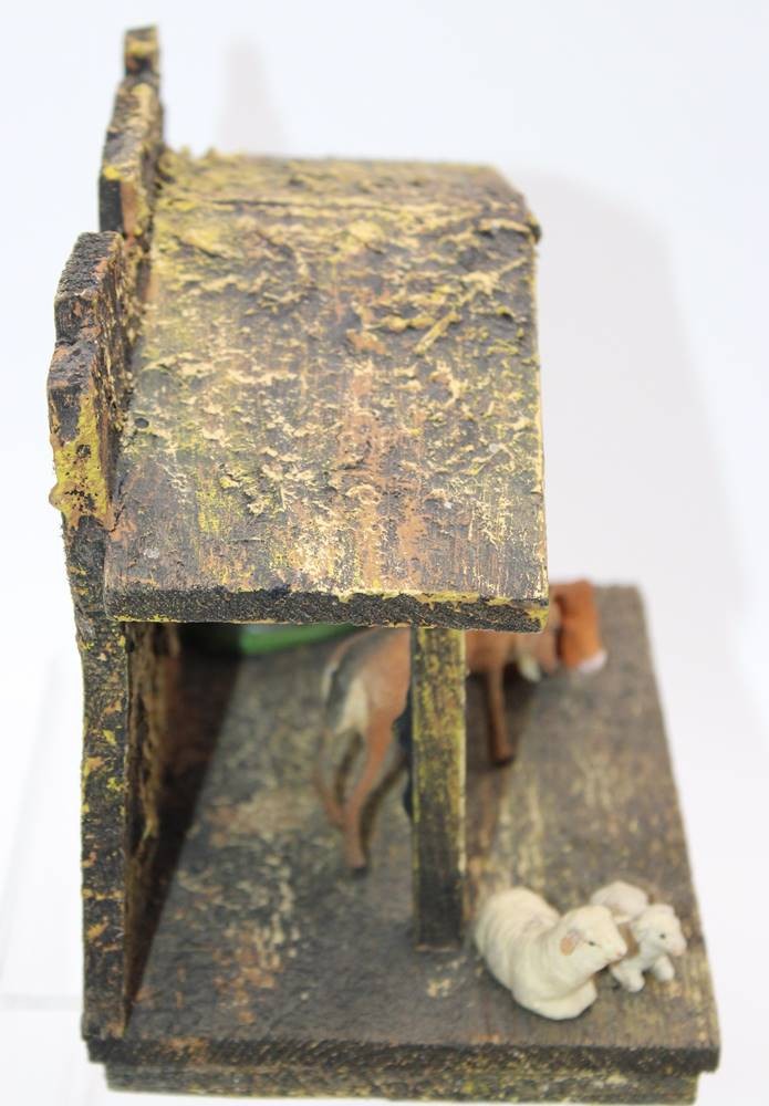 Weihnachts-Krippe, 11 Figuren anbei, Material?, älter, teilw. Altersspuren, ca. H-17cm B-23cm T-12,5cm. [1]