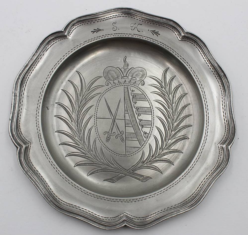 Zinn-Teller, Wappengravur, monogrammiert, D-23,5cm