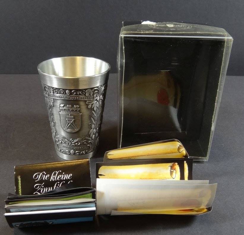 Zinnbecher mit Cuxhaven Wappen und Stadtteil-Wappen, neu in OVP, H-8,5 cm