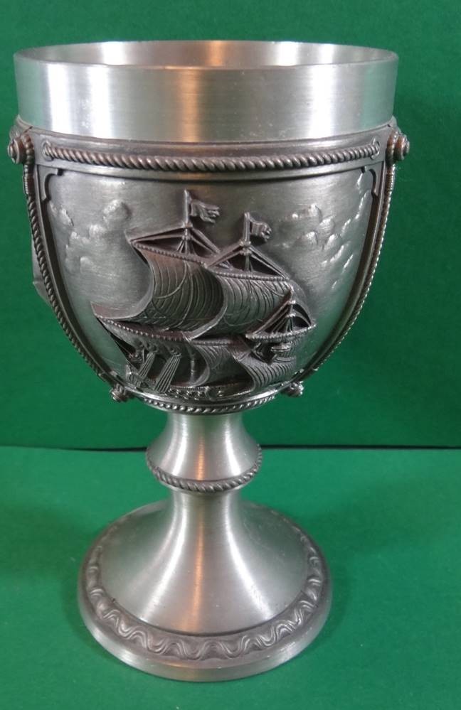 Zinnpokal mit Segelschiff-Motiven. H-14 cm [1]
